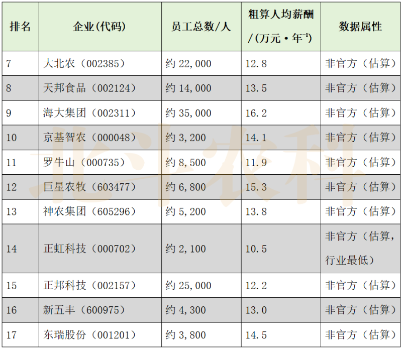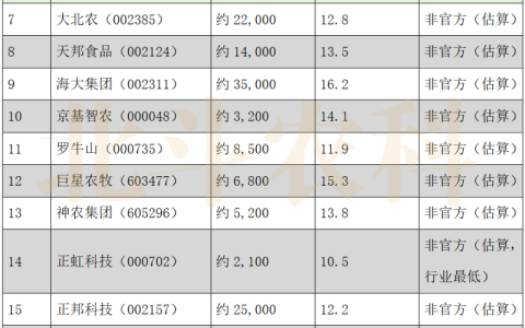 第三梯队(12-14万元/年):新希望、神农集团、傲农生物、天邦食品、大北农、罗牛山、正邦科技;