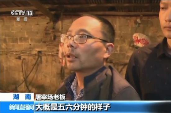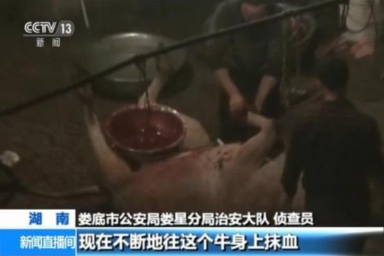 这家非法屠宰场位于娄星区的小巷内,位置十分偏僻。白天这里比较安静,据警方介绍,直到深夜的时候,不法商贩才会给牛注水。在夜里2点钟,记者随同警方,再次来到这里,对注水的过程进行拍摄取证。娄底市公安局娄星分局治安大队:用绳子拉着牛头,不让它动摇,现在这头牛还在不断地挣扎。几分钟之后,这头牛显得安静了不少,随后上演残忍一幕,让现场调查员触目惊心。几分钟之后,一个戴眼镜的男子,在牛肚子上割开了一个小口子,随后拿来一根导管刺入牛肚子进行放血。