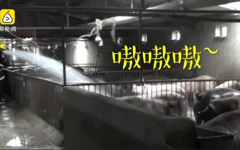 此时,猪舍里热浪滚滚,味道刺鼻,工人们进去几分钟就会感到呼吸困难。赶到的消防队员在做好防护措施后、进入猪舍,用手抬泵给这些大肥猪喷水降温,近一个小时后,猪舍里的味道被驱散了,洗过“淋浴”的猪又恢复了活力。