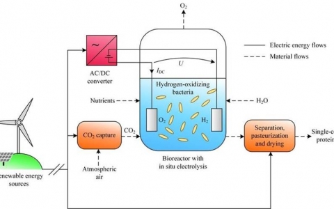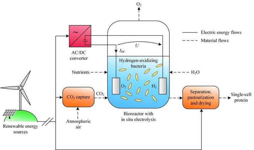 在将原材料放置到一个生物反应器中进行电解以后会形成一种粉末,这种粉末包含超过50%的蛋白质和25%的碳水化合物——这种结构可以通过改变生产过程中微生物的存在情况而加以改变。