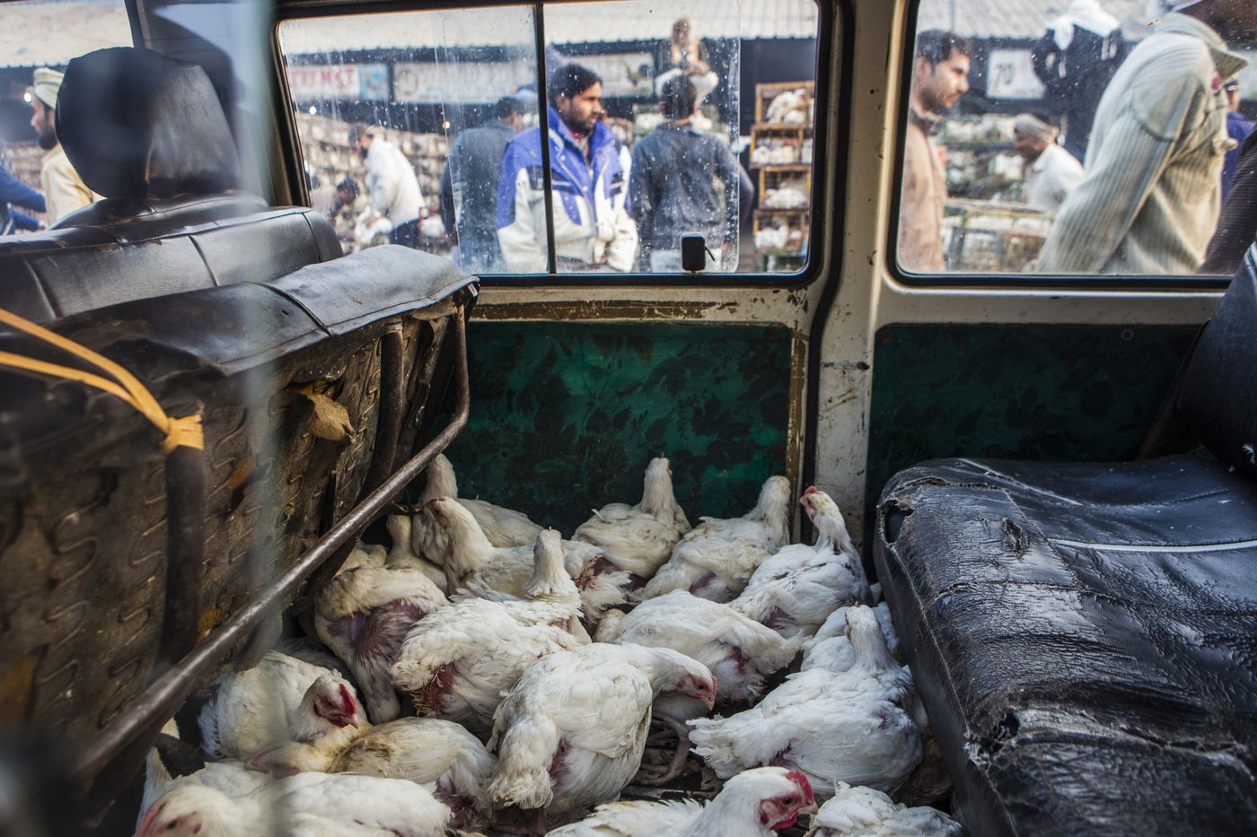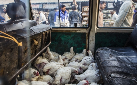 德里加济布尔家禽批发市场,许多鸡挤在一辆车里