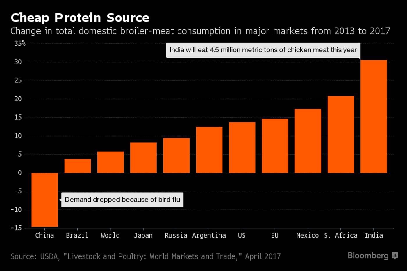 鸡肉是印度人的首选肉类。它比其他肉类便宜,且不太受制于宗教禁令和文化禁忌。据美国农业部的数据,自2013年以来,印度的鸡肉消费量增加了逾30%,增幅超过了所有主要市场。