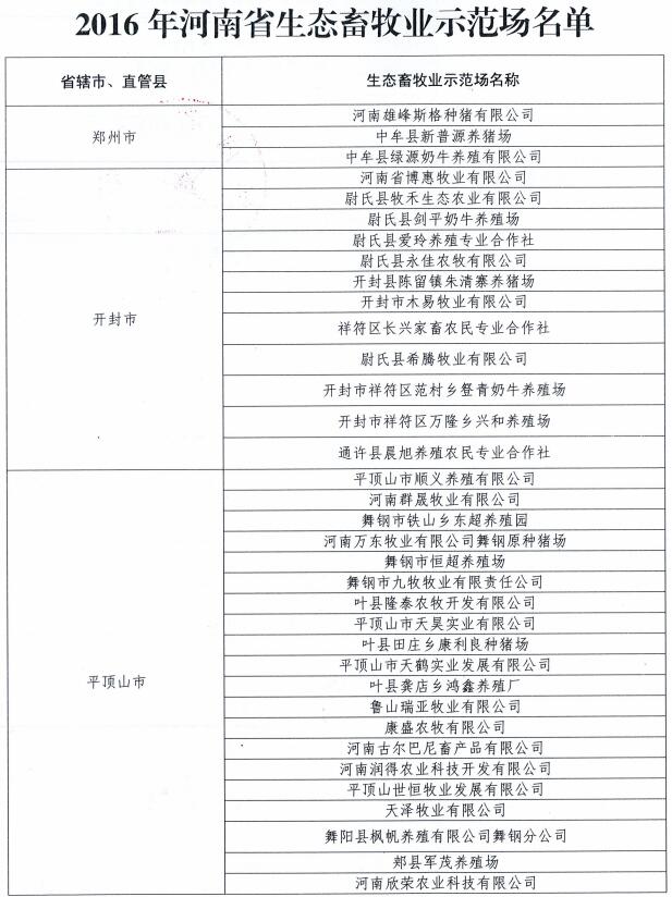 为推进我省生态畜牧业建设,提升畜牧专业合作社综合服务水平,根据《河南省生态畜牧业示范场创建方案的通知》和《河南省畜牧专业合作社省级示范社创建方案》的要求,经各地市推荐、专家逐项评分和现场实地抽验、省局示范创建领导小组研究,确定河南雄峰斯格种猪有限公司等117家养殖场为2016年河南省生态畜牧业示范场、荥阳市华鸣农牧专业合作社联合社等18家合作社为2016年河南省畜牧专业合作社省级示范社,现予以公布。