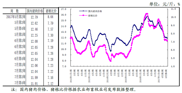8月15日农业部市场预警专家委员会发布的7月农产品供需形势分析月报显示,猪肉价格稳中略跌。受市场供给充足影响,猪肉价格连续6个月下跌,但由于高温和暴雨天气影响活猪运输,猪价跌幅有所放缓。7月份猪肉集贸市场价为每公斤24.00元,环比跌0.4%,同比跌20.6%。
