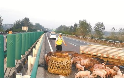 昨晨6时15分,高警当阳大队接警得知,一辆从当阳驶往贵州的货车爆胎,车上的100只小猪崽掉落在高速公路上。民警到达现场发现,大货车横在路中间,七八个猪笼散落在行车道上,一群小猪崽在高速公路上“撒欢”乱窜,不时有车辆疾驰而过,险象环生。