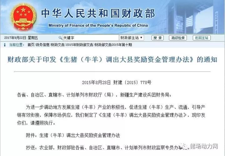 先看财政部的最新管理办法,这是来自2015年8月份的“财政部关于印发《生猪调出大县奖励资金管理办法》的通知”,里面对资金管理办法有详细的要求。