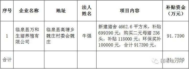 但是,我们也发现一些地方政府的做法可能就需要衡量了,比如安徽省临泉县,在其今年6月份公示的2017年临泉县生猪调出大县奖励资金项目验收单位显示,一家名为临泉县万和生猪养殖有限公司的猪场活动将近92万元的奖励,考虑到每个县市每年仅有几百万的奖励额度,把如此大比例的金额奖励给一个猪场,其做法显然值得商榷。