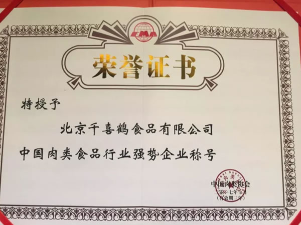 新希望六和旗下北京千喜鹤食品有限公司是北京市人民政府确定的大型生猪屠宰加工企业,是集生猪养殖、屠宰、冷鲜猪肉、冻品及副产品生产加工、物流配送、仓储及销售等为一体的现代化大型食品企业。公司屠宰车间全套引进德国伴斯屠宰生产线,分割车间均引进韩国好烤克分割生产线。公司实行同步检疫、两段冷却排酸和精细分割、冷链运输、配送销售等先进工艺流程。建有现场监控系统、生猪溯源系统和现代化实验室,对危害物进行全面检测。通过以上一系列质量保证体系和措施,确保产品质量合格。因此公司曾先后被评为“全国农产品加工业示范企业”、“北京市农业产业化重点龙头企业”、“全国猪肉安全生产与消费行动计划示范企业”、“中国肉类行业影响力品牌”等。(梁海霞 屈咏梅)