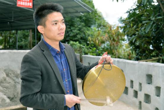 吴明亮以打锣为号,呼唤香猪饮食起居