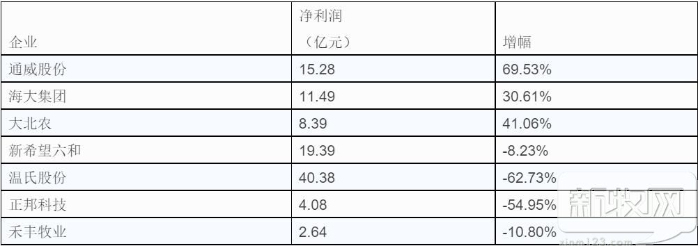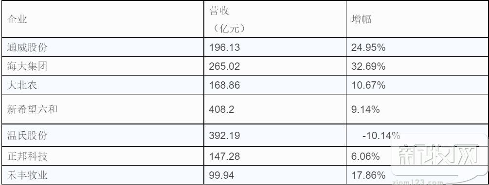 只有温氏营收出现下滑, 其他六家企业营收都实现了增长;营收增幅最大的是海大集团,增幅32.69%,其次是通威股份增幅24.95%。