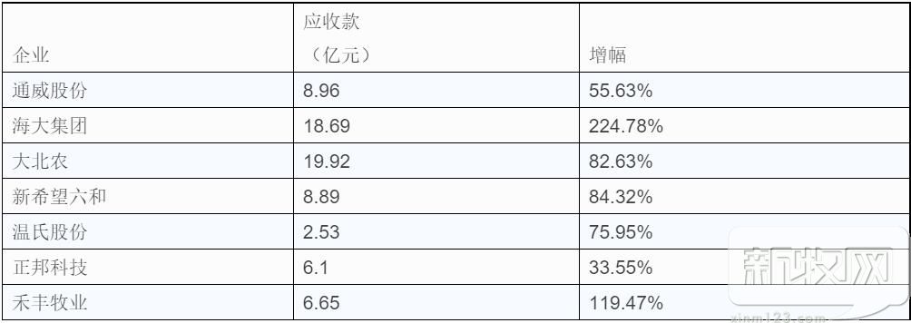 其中,海大、大北农应收款最大,分别达到18.69、19.92亿元,只有这两家企业应收款超10亿级别,遥遥领先其他企业。