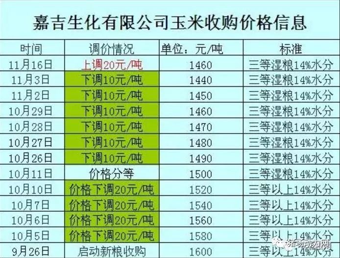 11月16日早6时开始嘉吉生化湿粮收购价格上调20元/吨,调整后14%水分二等收购价格1480元/吨,三等收购价格1460元/吨。水分小于等于30%扣量1:1.2;大于30%扣量1:1.25。