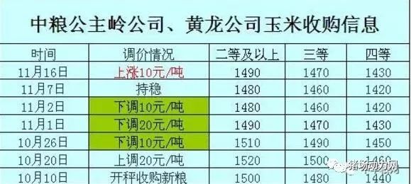中粮公主岭公司、黄龙公司11月16日7:00玉米收购价格上调10元/吨,各等级最新收购价格如下: