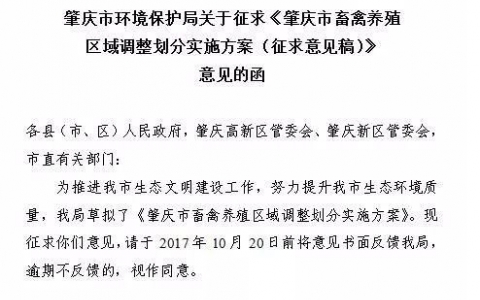 对此,四会市农业污染源(畜禽养殖)整治行动工作领导小组办公室答复称,四会市有关部门于10月18日收到《肇庆市环境保护局关于征求<肇庆市畜禽养殖区域调整划分实施方案(征求意见稿)>意见的函》(肇环函【2017】599号),并按照要求对该征求意见稿作出回复。