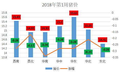 据猪易通锐奇数据监测本周(1月8日-1月14日)各地区生猪价格均呈现下跌走势。当前最高价是华东地区15.61元/公斤,最低价是东北地区14.42元/公斤;本周下跌幅度最大的是华南0.34元/公斤,西北地区跌幅最小0.17元/公斤。从2017年至今我们应该可以发现一个规律,东北地区猪价无论是下跌或者是上涨均担任急先锋的角色,其最大的特色就是涨若迅雷,跌似拉稀,往往短时间内价位就涨到或者跌倒全国最高、最低的位置。