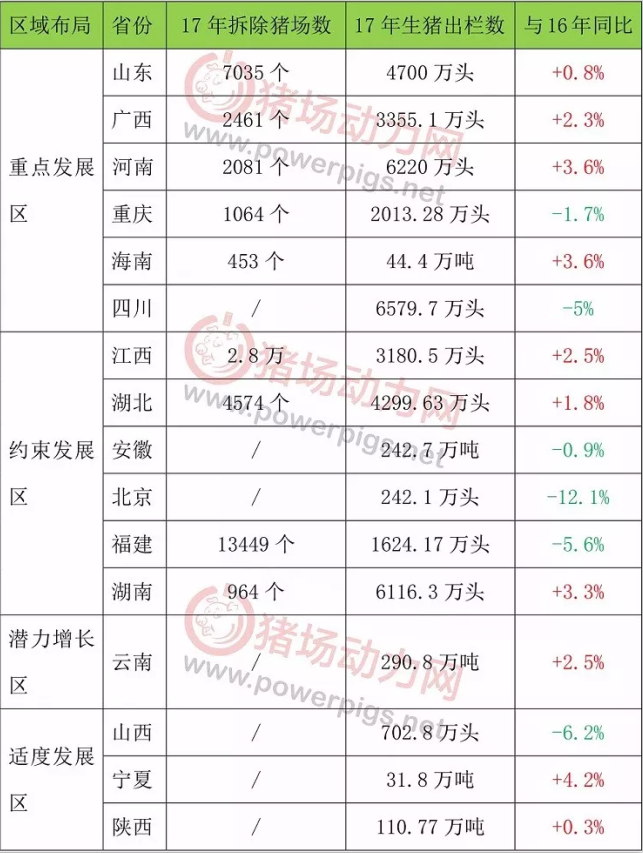 据相关数据统计,2017年划定畜禽养殖禁养区4.9万个,面积为63.6万平方公里,减少生猪存栏约2000万头,2016年因环保禁养各地调减生猪3600万头,从2016—2017年,各类政策层出不穷,环保禁养不断加大力度,南猪北养一步步提上日程,各区域生猪产业布局也出现大的变化。