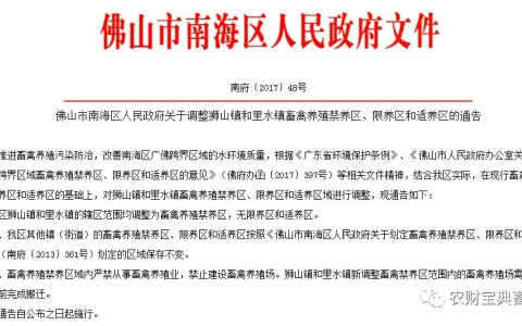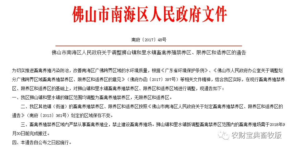 最新通知!广东省佛山市南海区狮山镇和里水镇的辖区范围均调整为畜禽养殖禁养区,无限养区和适养区。畜禽养殖禁养区域内严禁从事畜禽养殖业,禁止建设畜禽养殖场。狮山镇和里水镇新调整畜禽禁养区范围内的畜禽养殖场需于2018年9月30日前完成搬迁。