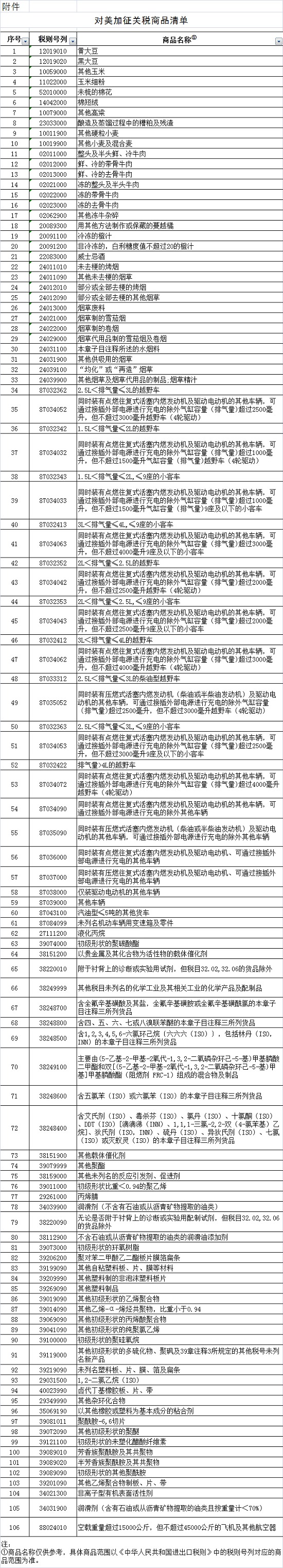 一、加征关税的商品为大豆、汽车、化工品等14类106项商品。征税范围详见附表。