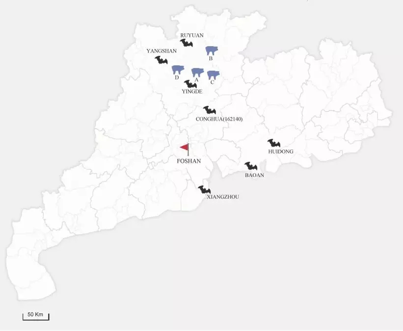 ▲此次爆发疫情的地区和周围蝙蝠栖息地分布(图片来源:doi.org/10.1038/s41586-018-0010-9)