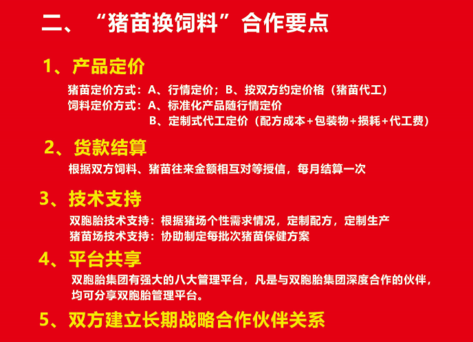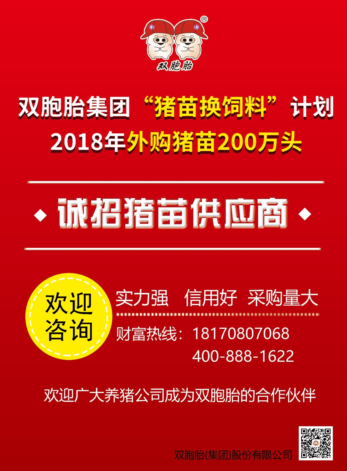 双胞胎集团从2017开始大举布局养猪,2018年将外购猪苗200万头。为满足养殖需求,双胞胎愿意与全国大型养猪公司开展“猪苗换饲料”合作,现向全国诚招优秀的猪苗战略供应商。