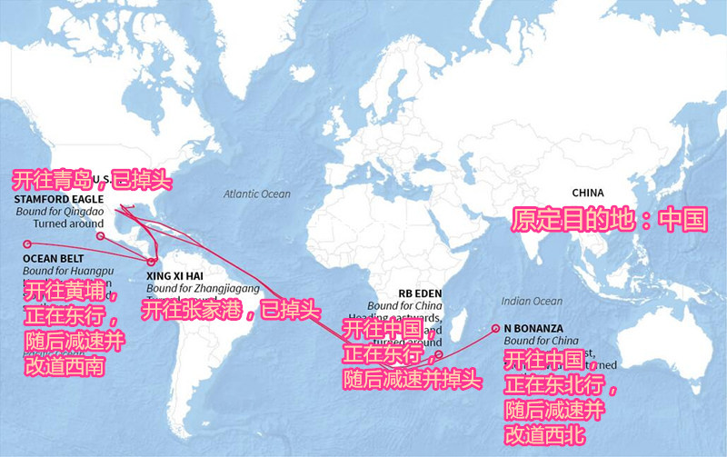 路透社的报道称,在20艘已经行驶在海上的船只中,至少有5艘在中国商务部发布公告后改变了航线。路透社绘制的图片显示,这5艘船从德克萨斯州墨西哥湾出港,有3艘原本分别驶往山东的青岛、广东的黄埔和江苏的张家港,另外2艘出已经进入了印度洋。