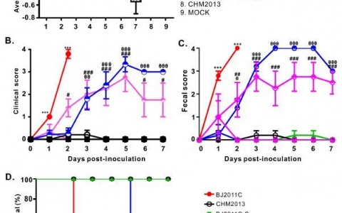 中国农业大学动物医学院猪病研究团队前期构建了基于流行毒株BJ2011C和低致病性毒株CHM2013的反向遗传操作平台(Li, et al, PLoS one,2017)。本研究在此基础上构建并拯救互换S基因、整个结构蛋白编码区(SP)以及3UTR的嵌合病毒,然后利用2日龄健康仔猪感染模型进行了致病性试验。研究结果发现,互换S基因后,BJ2011C失去致病性,但并未使CHM2013获得致病力。相反,互换SP编码区后,CHM2013嵌合病毒获得肠道定殖能力,引起典型PED临床症状,感染猪只持续排毒,且有明显肠道组织损伤。进一步交换3UTR后,CHM2013嵌合病毒毒力增强,引起部分猪只死亡(图一)。上述研究揭示,PEDV流行毒株毒力是多因子作用结果,S基因仅是BJ2011C致病的必要条件,结构蛋白编码区促进病毒在PEDV在仔猪肠道内定殖,并和3UTR协同作用,影响病毒致病力。本研究结果为阐明PEDV流行毒株的致病机制提供了科学依据,并为PEDV疫苗设计提供了重要的思路。