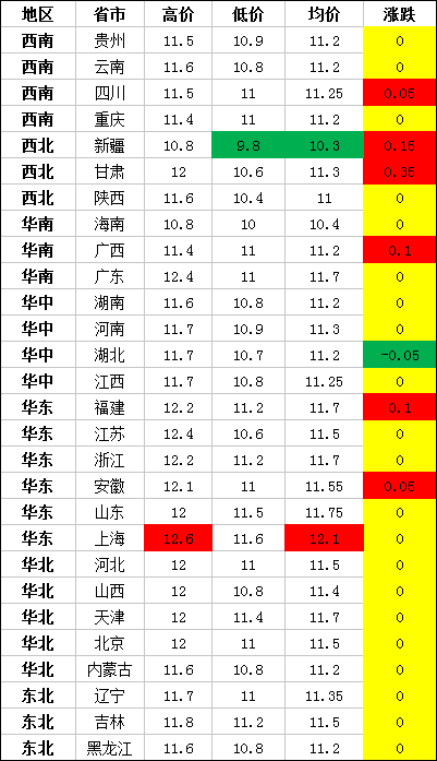 从各省市猪价来看,全国猪价最高是上海12.6元/公斤,猪价最低是新疆9.8元/公斤;均价最高是上海12.1元/公斤,均价最低是新疆10.3元/公斤。从涨跌幅度看,大部分地区猪价维持稳定,局部猪价涨跌调整。甘肃猪价上涨0.35元/公斤,新疆猪价上涨0.15元/公斤,四川、广西、安徽、福建猪价上涨0.05-0.1元/公斤,仅湖北猪价出现下跌0.05元/公斤,表现为西北低价区补涨幅度较大。