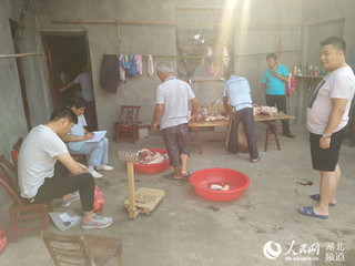6月15日,一大早,湖北阳新县驻村扶贫工作队带领村“两委”干部来到贫困户汪太夫家中,化身“猪贩”帮老汪家“推销”土猪肉。