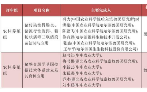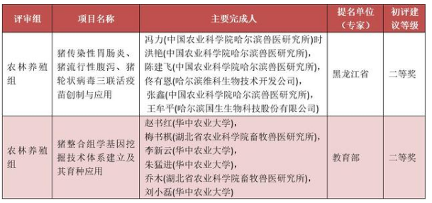分别是中国农业科学院哈尔滨兽医研究所冯力研究员等主持完成的“猪传染性胃肠炎、猪流行性腹泻、猪轮状病毒三联活疫苗创制与应用”(初评建议技术发明奖二等奖)