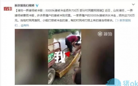 近日,山东潍坊,一养猪场被暴雨冲毁,许多养殖户的猪被冲到河里。一家养殖户的5000头猪被洪水冲走,损失达700万元。当地村民用渔网、小船打捞被冲走的猪,有的村民将打捞上来的猪当场宰杀。