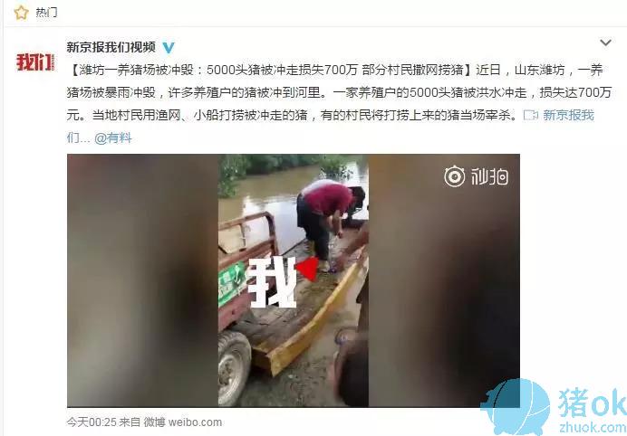 潍坊一养猪场被冲毁:5000头猪被冲走损失700万 部分村民撒网捞猪