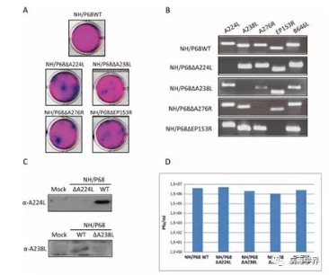 1、重组ASFV毒株的构建:研究人员通过使用反向遗传的方法,以野毒株NH/P68为骨架,构建了A238L蛋白缺失株,A224L蛋白缺失株,EP153R蛋白缺失株和A276R蛋白缺失株。