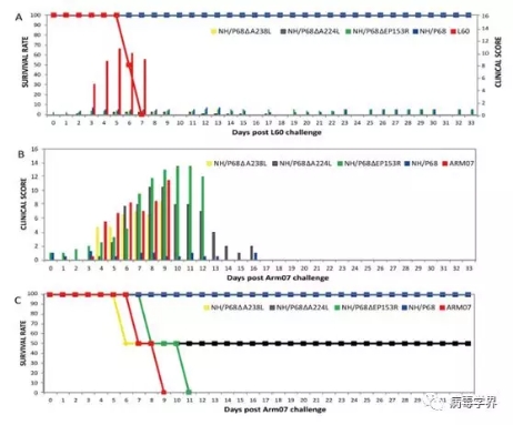 2、重组病毒的免疫保护试验:研究人员分别对免疫了A238L蛋白缺失株,A224L蛋白缺失株,EP153R蛋白缺失株和NH/P68原始毒株疫苗的猪只进行攻毒试验,发现缺失株和NH/P68疫苗免疫后的所有猪只都能够抵抗ASFV同源病毒L60的感染。对于ASFV异源病毒AEM07,NH/P68疫苗能完全抵抗AEM07的感染;而缺失株中,有半数免疫了A224L缺失株疫苗的猪只能抵抗AEW07的感染。