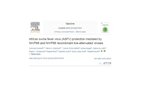近日,西班牙的科学家们通过构建重组病毒的方法,制备出了一种能够有效防控ASFV感染的弱毒活疫苗。目前,该研究成果已在线发表至“Vaccine”杂志,文章题为“African swine fever virus (ASFV) protection mediated by NH/P68 andNH/P68 recombinant live-attenuated viruses”。