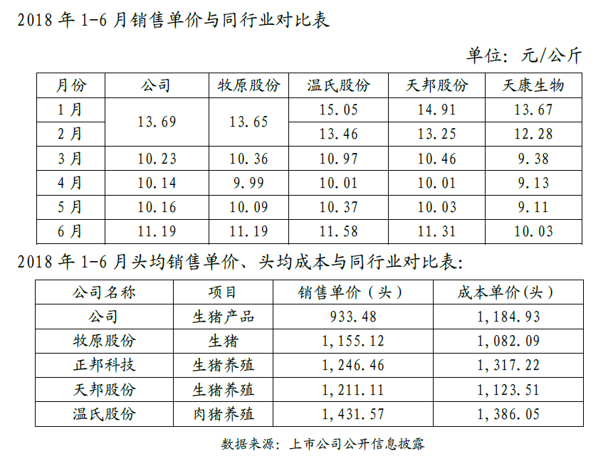 2018年1-6月销售简报中雏鹰农牧肉猪销售单价与同行业基本持平,由于各公司生猪产品结构不同,销售单价存在一定的差异。