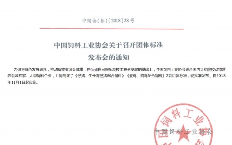 中国饲料工业协会10月26日批准发布《仔猪、生长育肥猪配合饲料》《蛋鸡、肉鸡配合饲料》两项团体标准,这是我国饲料和养殖业立足国情大力推进节本降耗和源头减排所采取的重要举措,也是进一步提升产业竞争力的有效措施。团体标准聚焦降低配合饲料蛋白含量,倡导高效低蛋白日粮体系应用,在我国饲料行业内有里程碑式意义。