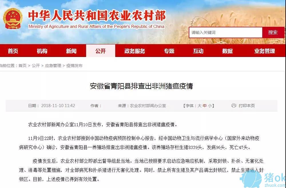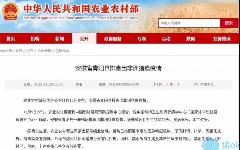 农业农村部新闻办公室11月10日发布,安徽省青阳县排查出非洲猪瘟疫情。