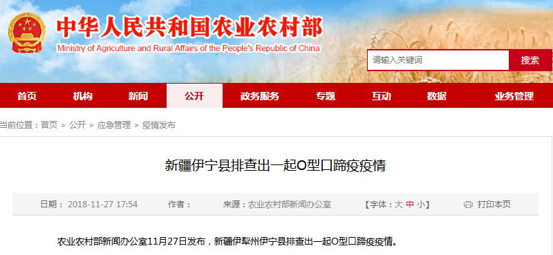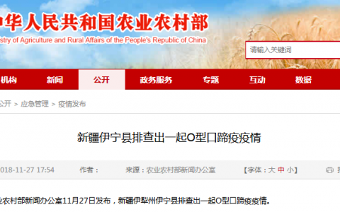 农业农村部新闻办公室11月27日发布,新疆伊犁州伊宁县排查出一起O型口蹄疫疫情。