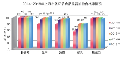 2018年,上海食品生产加工和流通两大环节的监督抽检合格率分别为99.5%和98.7%,均达到近8年来的最高水平。