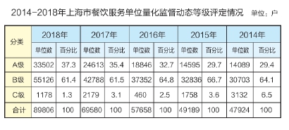 就监督情况来看,沪上餐饮服务业也保持了较高的守法经营水平。2018年上海市餐饮服务单位量化监督动态等级评定结果显示,89806户餐饮单位,等级为A(笑脸,良好)的占37.3%,B级(平脸,一般)占61.4%,C级(哭脸,较差)占1.3%。A级餐饮服务单位的比例比2015年高了7.6个百分点;C级餐饮服务单位的比例则低了2.3个百分点,为近8年来最少的。可见,越来越多的中下水平餐饮服务单位已经步入行业上游,或正在力争上游。