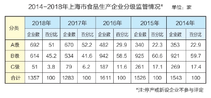 从“一味求多”的粗放式发展,转向内涵扩大再生产,上海食品产业正走向良性循环。虽然眼下,还有74.1%和71.9%的食品生产企业年销售额和年产值不到2000万元,处于“小、散、弱”状态,但已经开始加快向“大、集、优”转变的步伐。从量化分级管理的结果来看,2018年有51%的上海食品生产企业达到A级,比例比2015年多了28.7个百分点;3.8%的食品生产企业为C级,比例比2015年少了13.3个百分点,为2010年以来食品生产企业获“差评”比例最低的一年。
