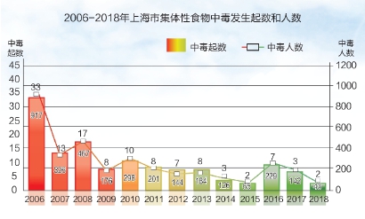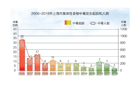 2018年,上海共报告发生集体性食物中毒2起,中毒人数43人(无死亡),集体性食物中毒发生率为0.18例/10万人口,未发生重大食品安全事故。同比2017年,集体性食物中毒起数、人数和发生率同比分别下降33.3%、69.7%和69.5%,为2006年以来相关数值最低的一年,堪称“最安全”的一年。