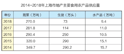 近年来呈现缩减态势的地产主要食用农产品供应量,进一步加剧了上海食品供给对外依赖的程度。2018年,上海地产蔬菜270万吨,产量比2015年减少了15.63%;地产水产品9.4万吨,产量比2015年减少了37.75%;73万头的生猪产量,则为近8年最低谷。