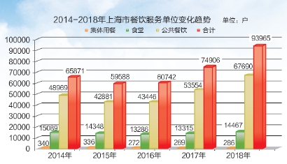 和正在经历转型期的食品生产业不同,上海的餐饮服务业却是风生水起。截至2018年底,上海共有持证餐饮服务单位93695户,数量是2015年的1.57倍,足足多出3.4万多户,平均下来一年新增1万多户。其中,公共餐饮单位67690户(特大型饭店116户,大型饭店2551户,中型饭店11389户,小型饭店42573户,其他如快餐店、小吃店、饮品店等11061户)、食堂14467户、现制现售11078户、集体用餐配送单位286户、中央厨房118户。2018年,上海还有9207户小型餐饮服务提供者实施了临时备案,可在限定的时间、经营范围等条件下经营。
