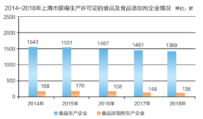 和食品销售业的繁荣相比,上海的食品生产业近年进入了“减量期”——获得食品生产许可证的企业连续11年减少,从2010年底的2210家减少到2018年底的1369家,减少了38%。