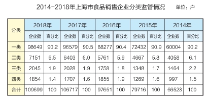 不过,食品销售业的“热闹”,并未“冲淡”整个行业的质量。2018年,上海109699户食品销售企业(不含个体工商户)按违法情况进行分级管理:无违法记录的,认定为一类企业;有轻微违法记录的,认定为二类企业;有一般违法记录的,认定为三类企业;有严重违法记录的,认定为四类企业。结果,90.2%的企业被评为一类。在食品销售经营主体数量同比2017年增加了40.1%的基础上,一类企业占比仍能保持在九成以上,说明食品销售业总体的守法水平在不断提高。