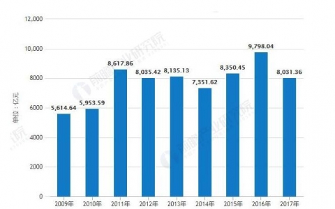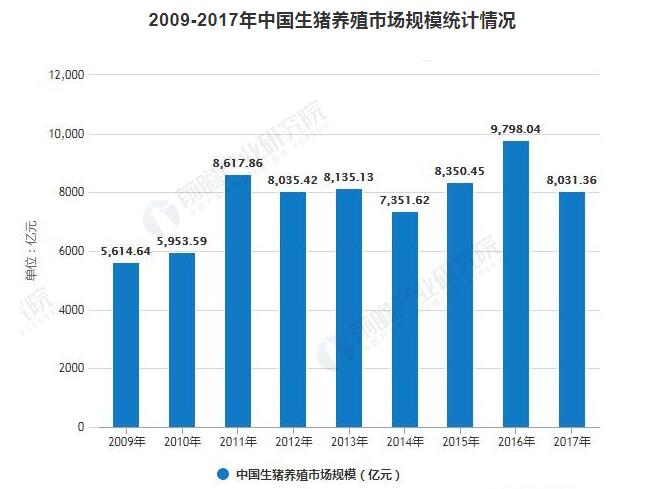据前瞻产业研究院发布的《中国生猪养殖行业市场前瞻与投资预测分析报告》统计数据显示,2009年中国生猪养殖市场规模已达5614.64亿元。2011年中国生猪养殖市场规模增长至8617.86亿元,此后中国生猪养殖市场规模开始下跌直至2015年。不过在2016年中国生猪养殖市场规模增长到一个高峰,达到9798.04亿元,截止至2017年中国生猪养殖规模为8031.36亿元,同比下降18%;预计2018年生猪养殖规模将会进一步的减小,初步测算2018年中国生猪养殖市场规模跌破8000亿元。