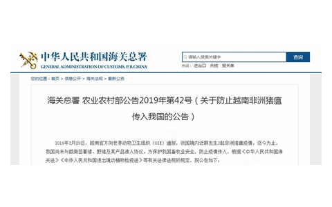 2019年2月20日,越南官方向世界动物卫生组织(OIE)通报,该国境内近期发生3起非洲猪瘟疫情。迄今为止,我国尚未与越南签署猪、野猪及其产品准入协议。为保护我国畜牧业安全,防止疫情传入,根据《中华人民共和国海关法》《中华人民共和国进出境动植物检疫法》等有关法律法规的规定,现公告如下: