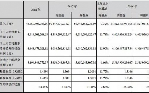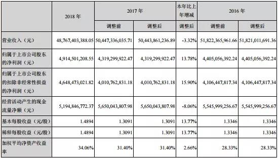 3月15日,双汇发展公布2018年年报,2018年公司实现营业收入487.67亿元,同比下降3.25%;实现利润总额63.32亿元,同比上升9.94%;实现归属于母公司股东的净利润49.15亿元,同比上升13.78%。