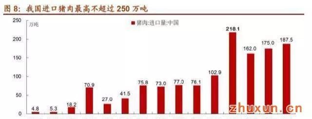 我国年均猪肉进口量不到200万吨,即便全球可出口猪肉总量300多万吨猪肉全部出口到中国,也难以缓解我国生猪的缺口。另外如果加大猪肉进口数量,可能造成国外猪价大幅上涨。例如美国2019年猪肉产量为1262万吨,出口10%到中国为126万吨,这对中国的需求来说很少,但是对美国的猪价影响会很大。